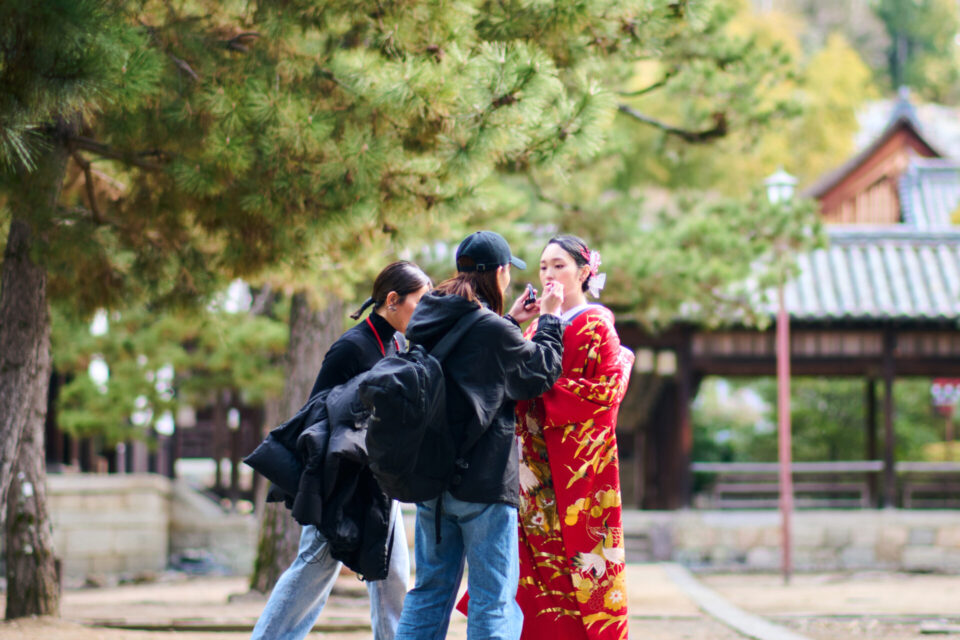 カメラスタッフも、着付けの具合など念入りに調整。