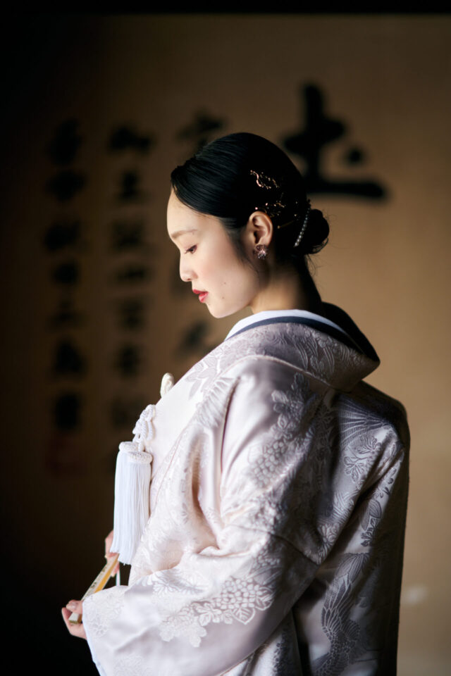 白無垢に合わせたブルーグレージュの色掛下がアクセントになったコントラストの美しいショット。