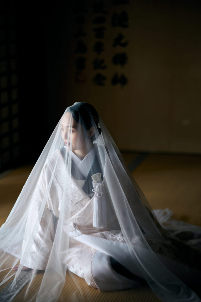 室内での撮影では、ベールを被った和洋折衷スタイルに。